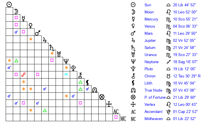 | Sun | 20 Libra 45 | 21 Libra 36 | 6 Sagittarius 53 |