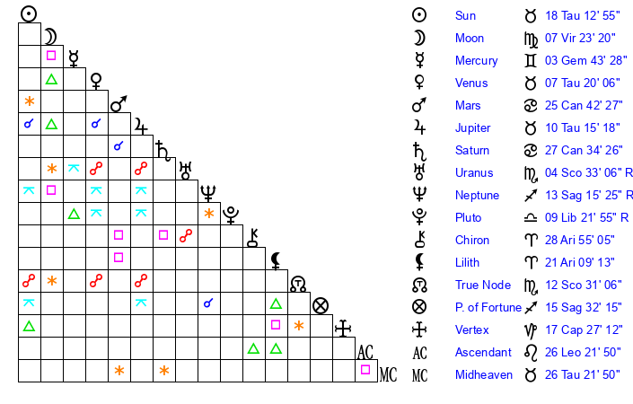 | Sun | 18 Taurus 12 | 18 Taurus 21 | 5 Cancer 11 |
