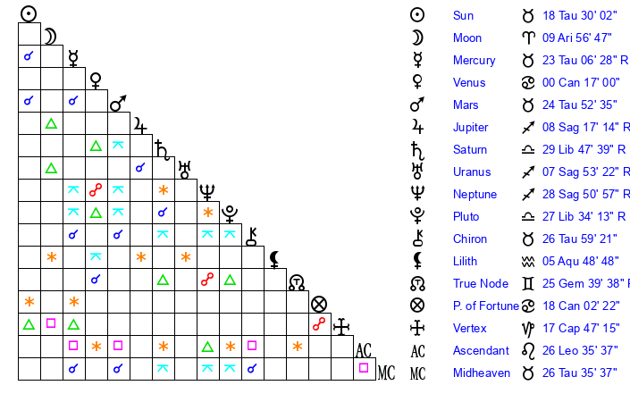 | Sun | 18 Taurus 30 | 19 Taurus 19 | 28 Gemini 48 |