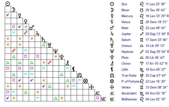 Moon | 29 Taurus 33 | 5 Sagittarius 27 | 7 Taurus 31 |