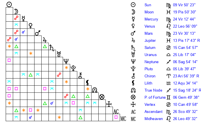 | Mercury | 24 Virgo 13 | 0 Virgo 17 | 4 Scorpio 4 |