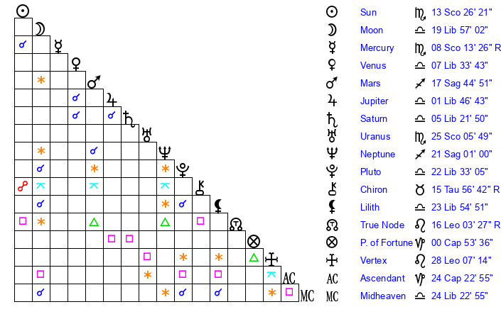 | Sun | 13 Scorpio 26 | 13 Scorpio 32 | 28 Sagittarius 59 |