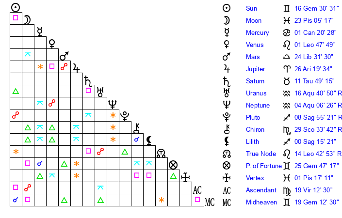 Jupiter | 26 Aries 24 | 29 Gemini 31 | 0 Taurus 54 |