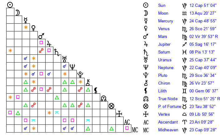 Mercury | 24 Capricorn 49 | 23 Sagittarius 26 | 16 Aquarius 8 |