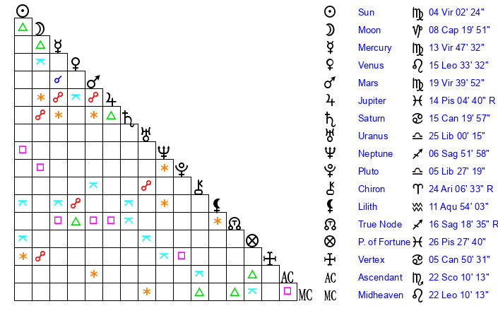 | Moon | 8 Capricorn 24 | 25 Libra 50 | 22 Scorpio 5 |