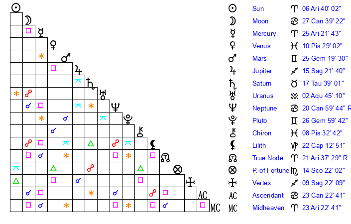 | Sun | 6 Aries 40 | 7 Aries 16 | 25 Cancer 39 |