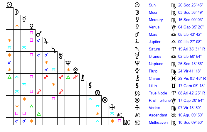 Sun | 26 Scorpio 26 | 26 Scorpio 51 | 23 Capricorn 21 |