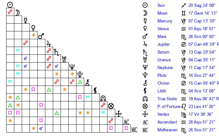 Pluto | 16 Scorpio 27 | 0 Aquarius 30 | 17 Scorpio 26 |