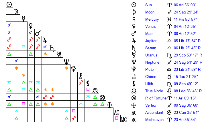 | Saturn | 6 Libra 49 | 23 Pisces 53 | 3 Libra 57 |