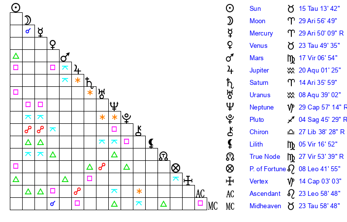 | Moon | 29 Aries 58 | 28 Leo 42 | 9 Taurus 23 |