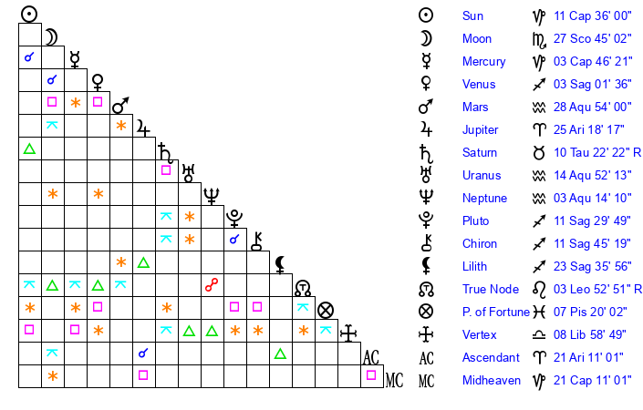 Moon | 27 Scorpio 43 | 17 Aquarius 5 | 29 Libra 59 |