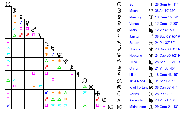 Sun | 28 Gemini 54 | 29 Gemini 37 | 27 Cancer 31 |