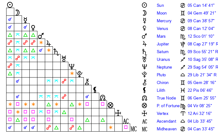 | Moon | 4 Gemini 49 | 22 Cancer 20 | 16 Sagittarius 47 |