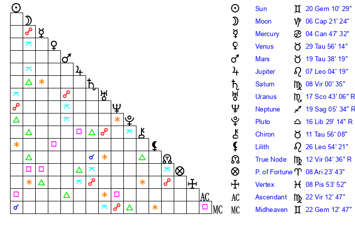 | Moon | 6 Capricorn 19 | 25 Sagittarius 28 | 13 Virgo 43 |