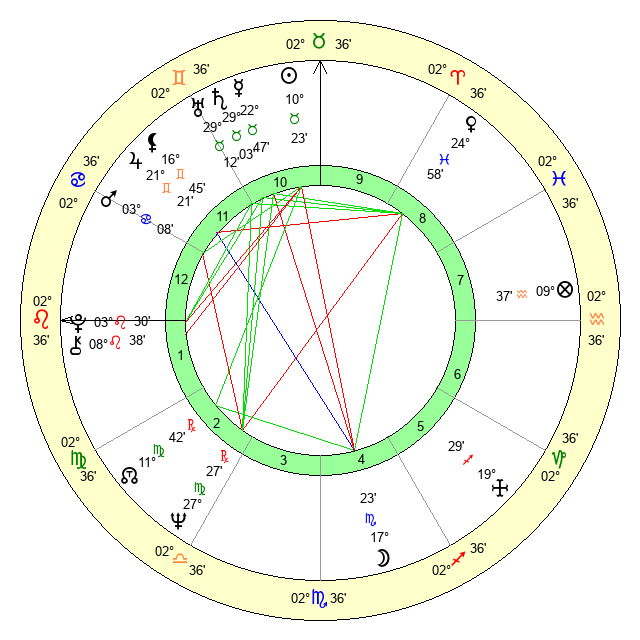 | Moon | 17 Scorpio 24 | 1 Cancer 36 | 28 Scorpio 47 |