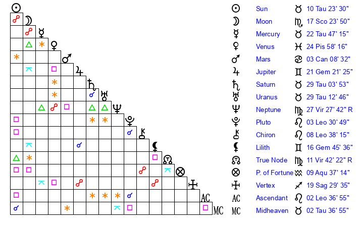 | Moon | 17 Scorpio 24 | 1 Cancer 36 | 28 Scorpio 47 |