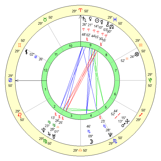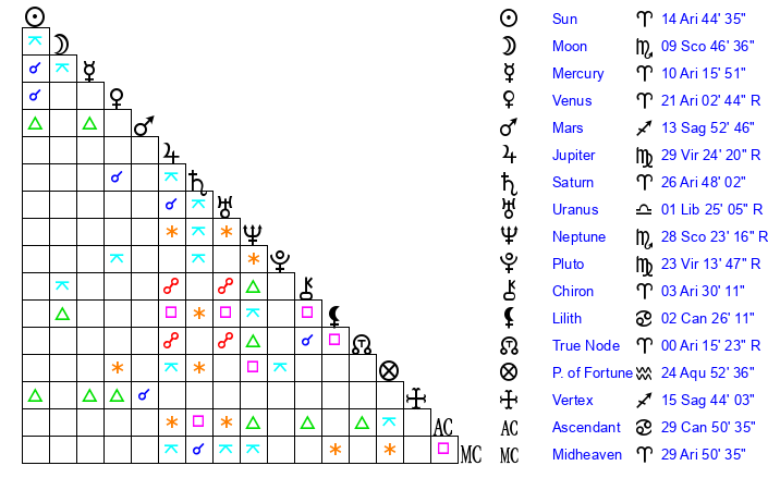 | Sun | 14 Aries 45 | 15 Aries 10 | 9 Gemini 5 |