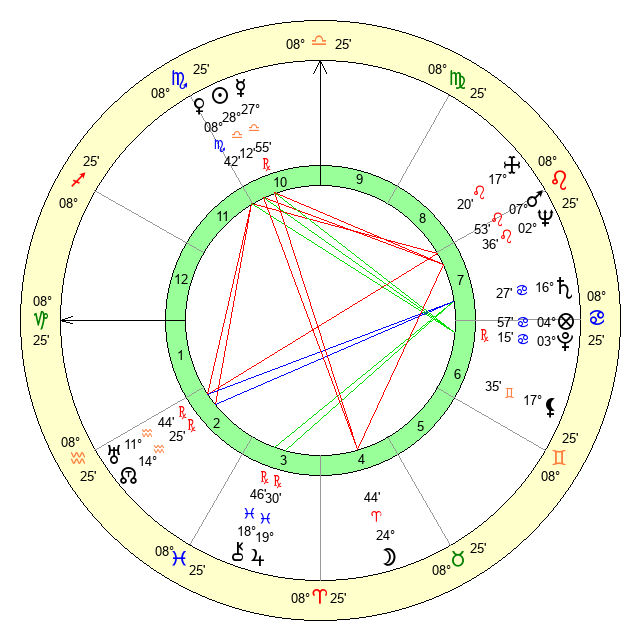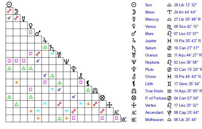 | Moon | 24 Aries 40 | 12 Scorpio 33 | 5 Taurus 54 |