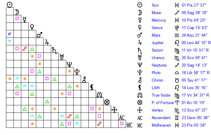| Saturn | 11 Virgo 41 | 19 Pisces 37 | 8 Virgo 21 |
