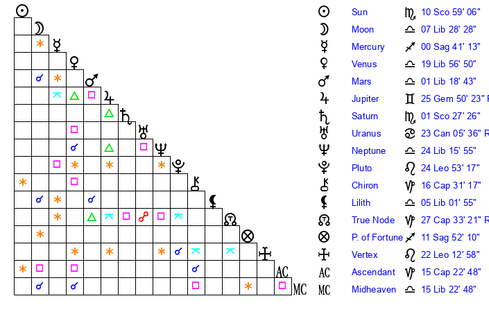 Moon | 7 Libra 28 | 6 Sagittarius 3 | 15 Taurus 14 |