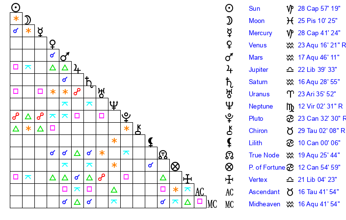| Saturn | 16 Aquarius 39 | 16 Pisces 5 | 26 Aquarius 26 |