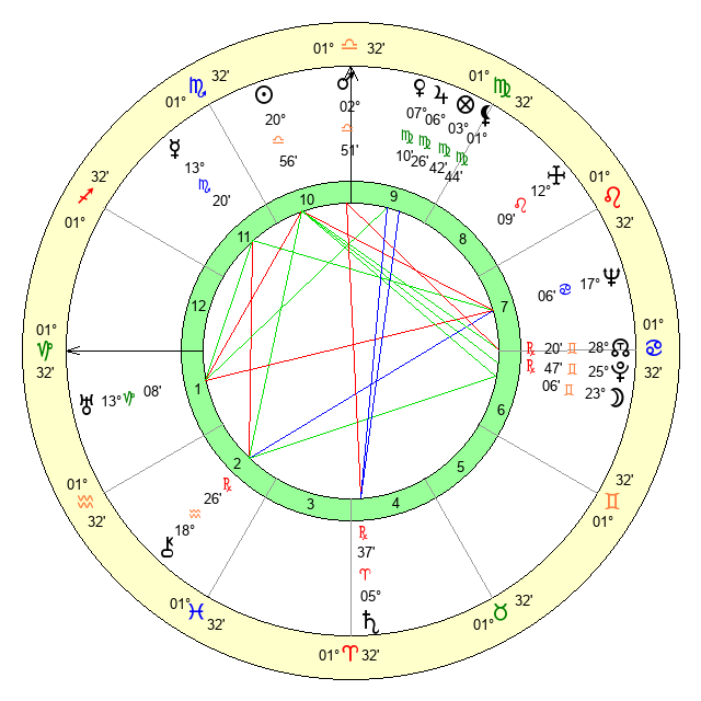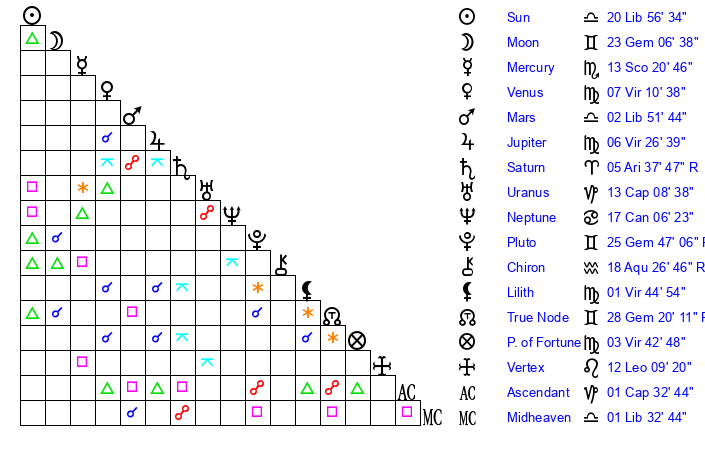 | Sun | 20 Libra 57 | 21 Libra 36 | 19 Aquarius 19 |