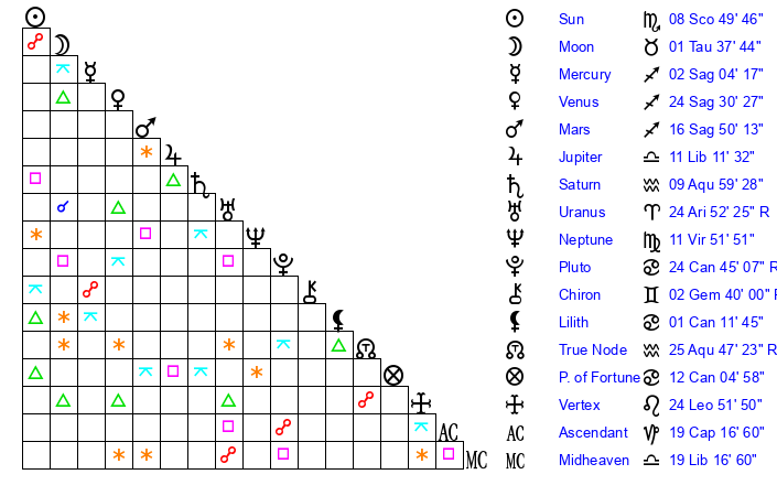 | Moon | 1 Taurus 33 | 16 Pisces 41 | 4 Virgo 38 |