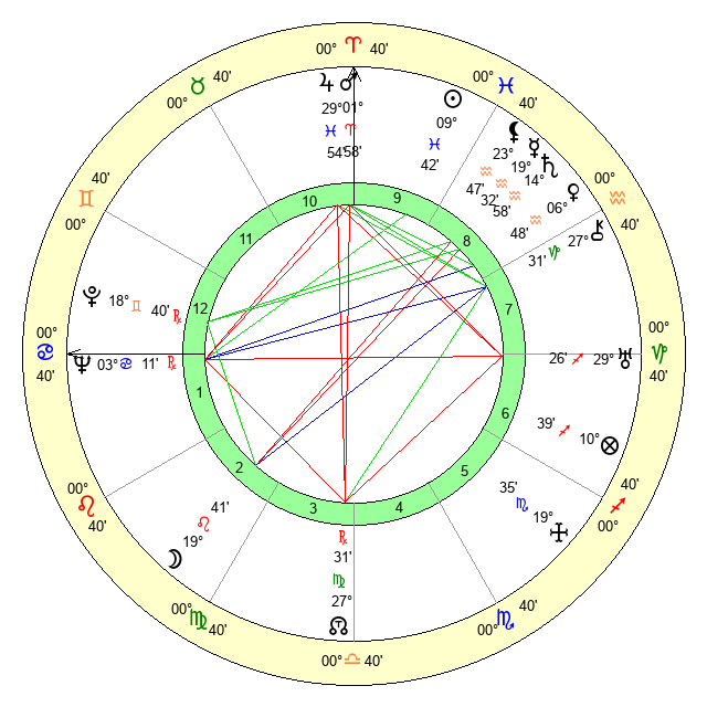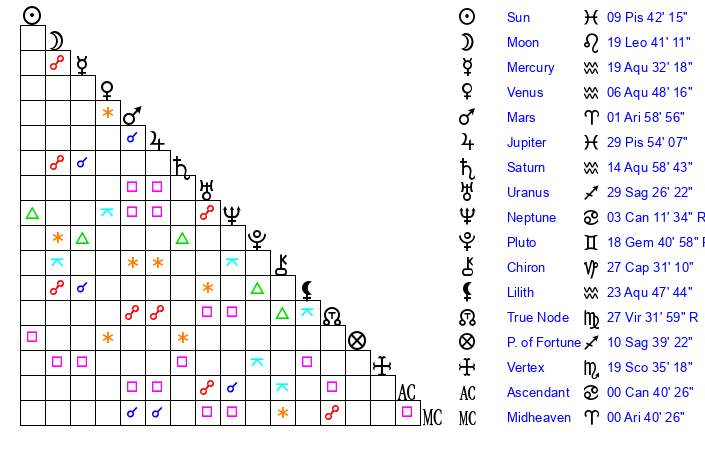 | Sun | 9 Pisces 42 | 11 Pisces 22 | 7 Cancer 28 |
