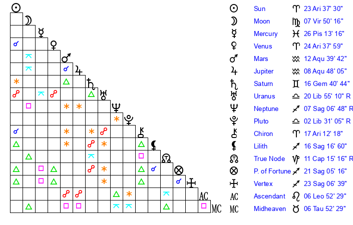Sun | 23 Aries 37 | 24 Aries 1 | 13 Gemini 55 |