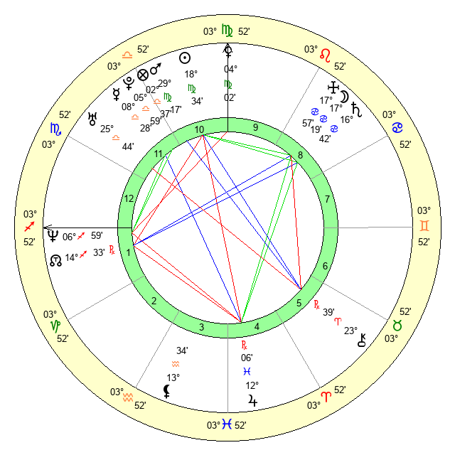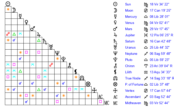 | Sun | 18 Virgo 34 | 19 Virgo 12 | 8 Scorpio 53 |