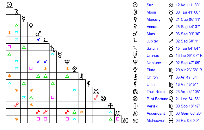 Venus | 25 Sagittarius 44 | 28 Pisces 0 | 27 Aquarius 46 |