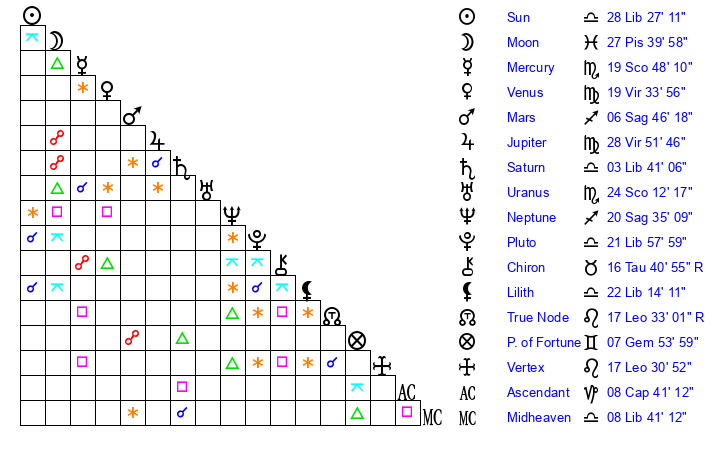 | Saturn | 4 Libra 3 | 26 Pisces 13 | 8 Libra 28 |