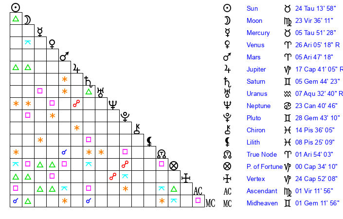 | Sun | 24 Taurus 14 | 25 Taurus 7 | 11 Virgo 32 |