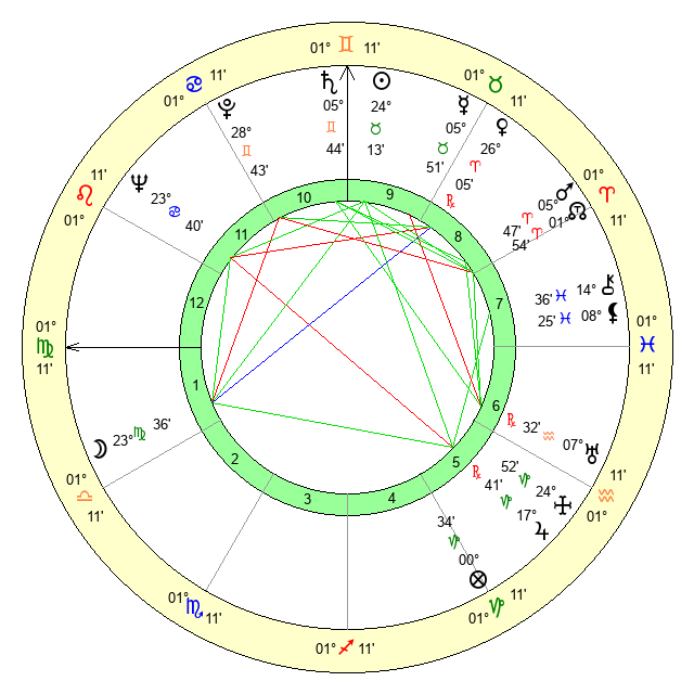 | Moon | 23 Virgo 43 | 28 Sagittarius 30 | 5 Scorpio 10 |