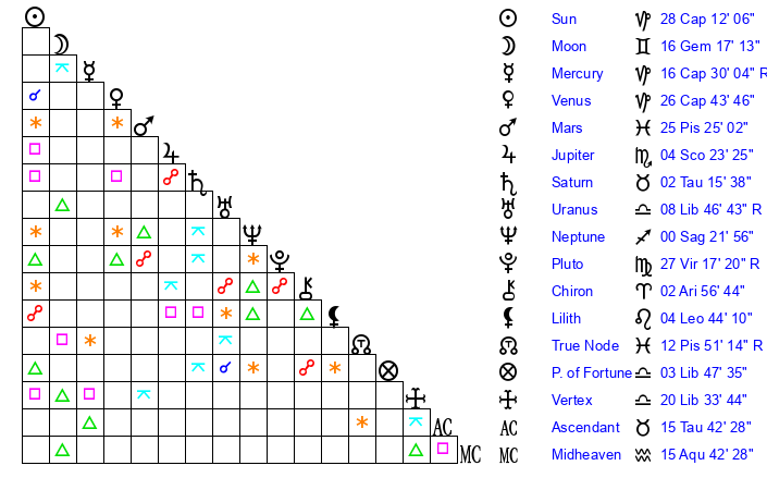 Moon | 16 Gemini 14 | 24 Virgo 40 | 21 Gemini 45 |