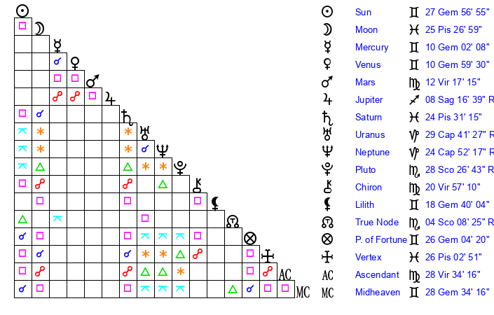 Sun | 27 Gemini 57 | 28 Gemini 40 | 26 Cancer 33 |
