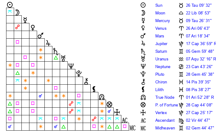| Sun | 26 Taurus 9 | 27 Taurus 2 | 13 Virgo 28 |