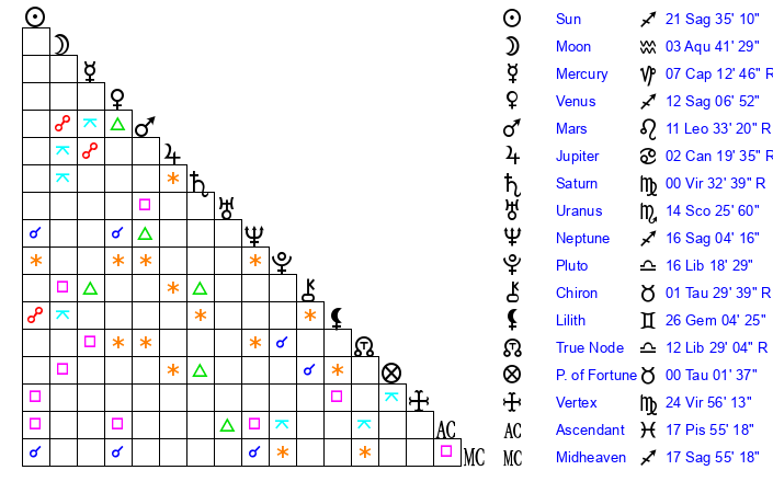 | Neptune | 16 Sagittarius 4 | 27 Pisces 8 | 17 Sagittarius 38 |