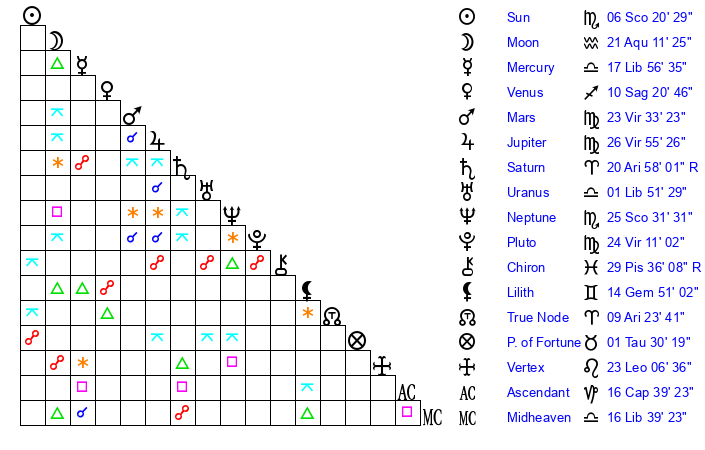 Moon | 21 Aquarius 11 | 6 Libra 9 | 10 Pisces 12 |