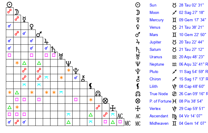 Sun | 28 Taurus 3 | 28 Taurus 0 | 22 Gemini 1 |