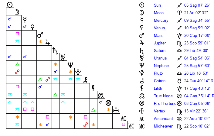| Neptune | 25 Sagittarius 59 | 27 Pisces 9 | 27 Sagittarius 32 |