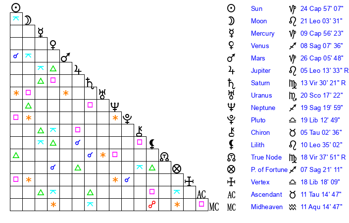 | Moon | 21 Leo 3 | 17 Leo 19 | 5 Taurus 38 |