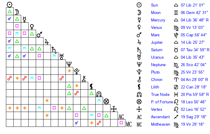 Sun | 7 Libra 21 | 7 Libra 47 | 3 Sagittarius 15 |