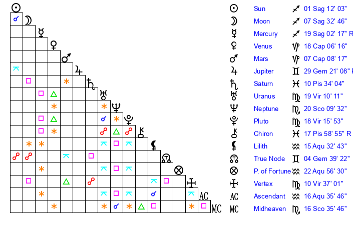 Moon | 7 Sagittarius 28 | 9 Virgo 8 | 1 Aquarius 41 |