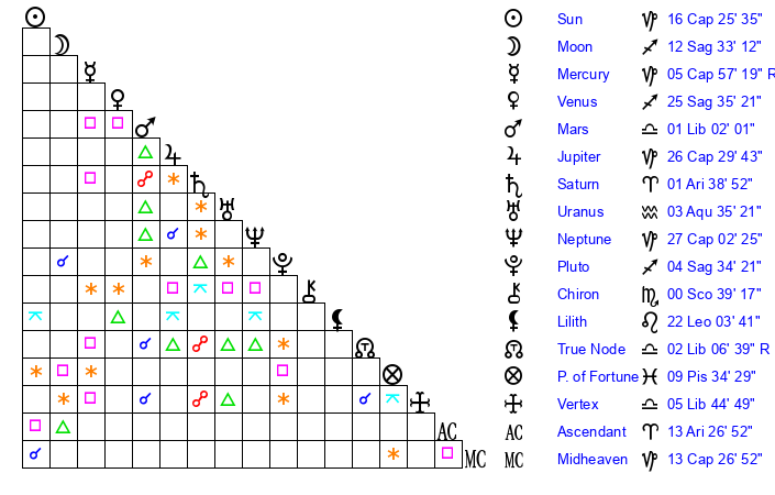 Moon | 12 Sagittarius 32 | 12 Aries 52 | 20 Sagittarius 40 |