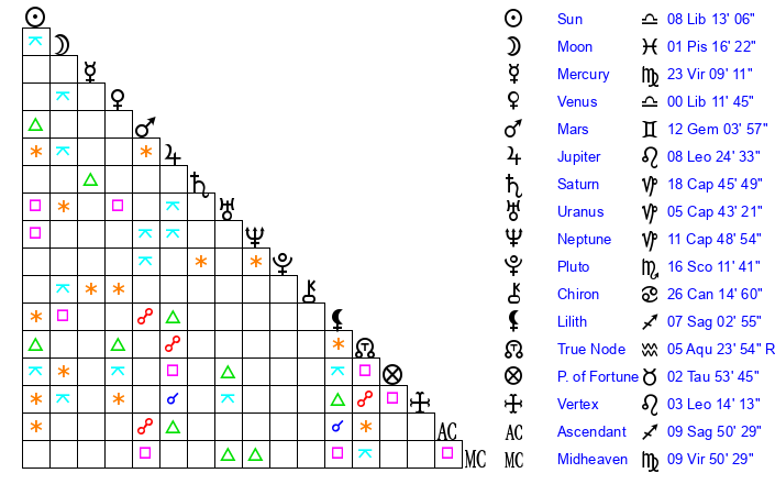 Mercury | 23 Virgo 9 | 22 Libra 14 | 21 Scorpio 48 |