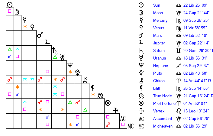 Moon | 24 Capricorn 21 | 16 Leo 31 | 5 Capricorn 59 |