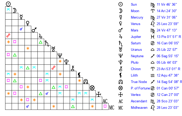 | Sun | 11 Virgo 46 | 12 Virgo 25 | 1 Scorpio 54 |