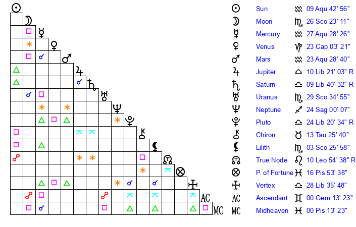 | Moon | 26 Scorpio 16 | 12 Aquarius 20 | 14 Cancer 38 |