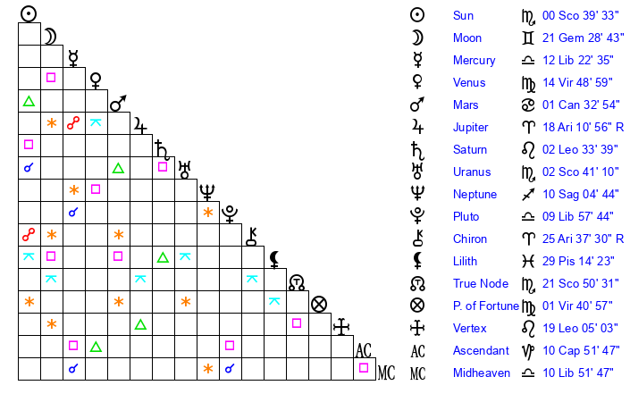 | Sun | 0 Scorpio 39 | 1 Scorpio 32 | 21 Sagittarius 3 |